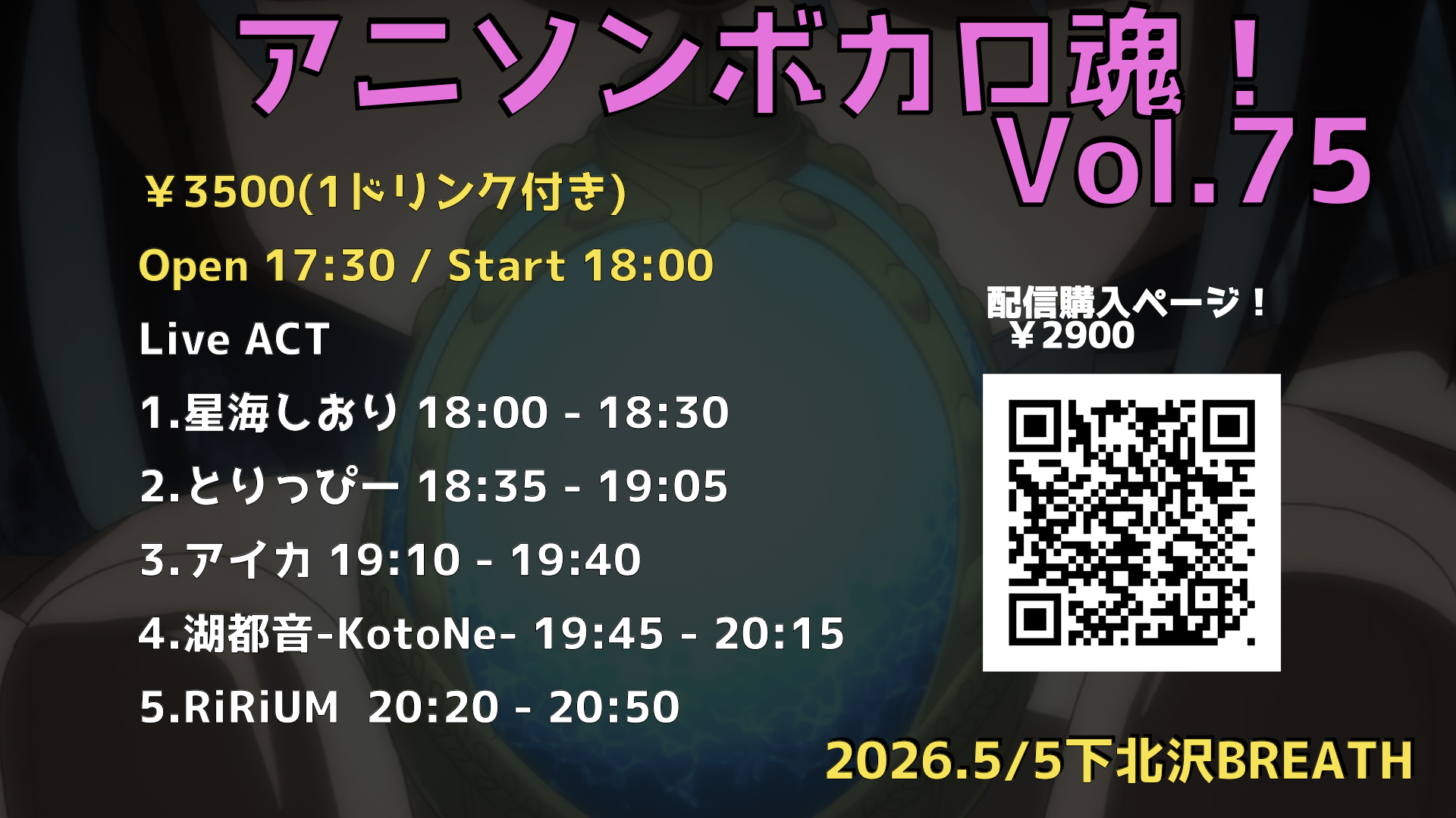 ☽ 夜 ☽ アニソンボカロ魂!Vol.75 5月 5 Tue 2026 LIVE EVENT 配信チケット 購入ページはこちら! 前のスケジュール 次のスケジュール 関連スケジュール ☀ 昼 ☀ 葉山理蘭生誕ワンマンライブ よ… ☽ 夜 ☽「謎紳士がもてなすMysterious Circus IN… ☀ 昼 ☀ あったかハートは Rock on… ☽ 夜 ☽ BLACKOUT RHYTHM…