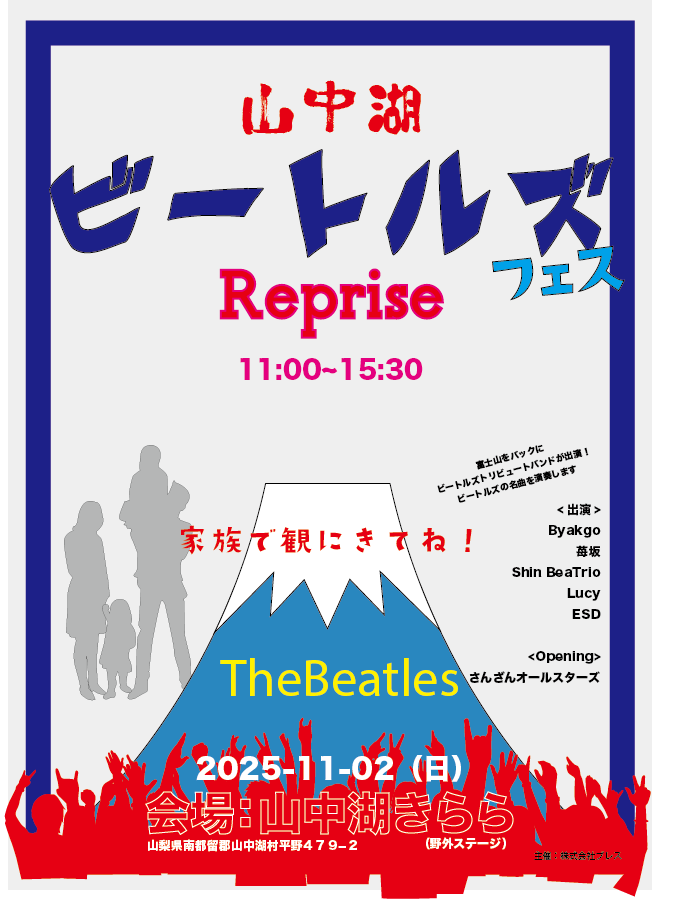 ⛺野外イベント⛺ ☀昼 ☀ 山中湖ビートルズフェス Reprise 11月 2 Sun 2025 THE BEATLES EVENT <注意> 会場はBREATHではありません。「山中湖 きらら 野外ステージ」となります。 入場無料 前のスケジュール 次のスケジュール