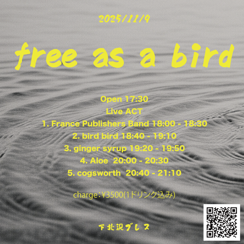 ☽ 夜 ☽ Free as a bird 11月 9 Sun 2025 LIVE EVENT Open 17:30 Charge 1drink込み ¥3500 配信チケット ¥2900 配信チケット¥2900 購入ページはこちら! 前のスケジュール 次のスケジュール