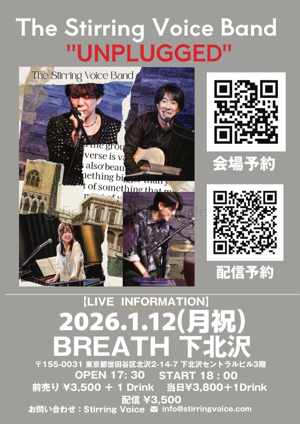 ☽ 夜 ☽ The Stirring Voice Band “UNPLUGGED” 1月 12 Mon 2026 LIVE EVENT Open 17:30 前売り 3500 / 当日 ¥3800 (別途1drink ¥600) 配信 ¥3500 前売りチケット ¥3500 購入ページはこちら! 配信チケット¥3500 購入ページはこちら! 前のスケジュール 次のスケジュール