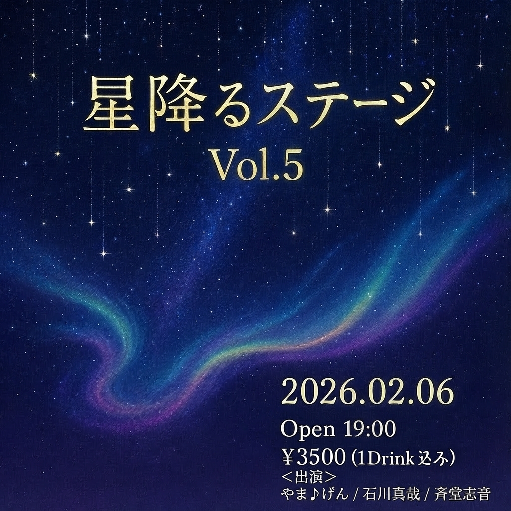 星降るステージ Vol.5 2月 6 Fri 2026 LIVE EVENT Open 19:00 Charge ¥3500 (1Drink込み) 配信 ¥2900 配信チケット¥2900 購入ページはこちら! 前のスケジュール 次のスケジュール