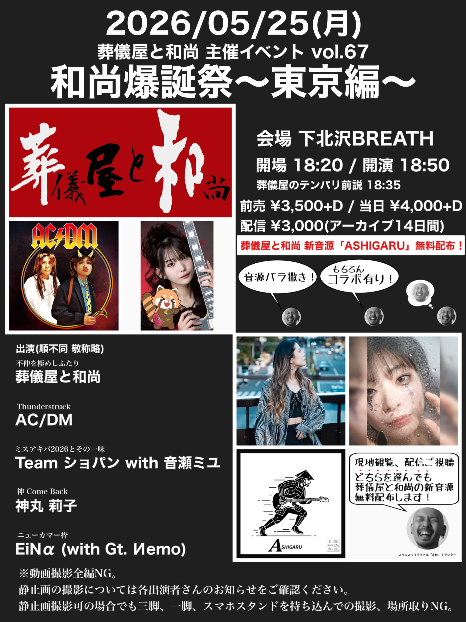 葬儀屋と和尚 主催イベント vol.67 和尚爆誕祭〜東京編〜 5月 25 Mon 2026 LIVE EVENT 予約ページ 🎫予約 ページはこちら! 配信チケット 購入ページはこちら! 前のスケジュール 次のスケジュール 関連スケジュール ☀ 昼 ☀ 葉山理蘭生誕ワンマンライブ よ… ☽ 夜 ☽ アニソンボカロ魂!Vol.75 ☽ 夜 ☽「謎紳士がもてなすMysterious Circus IN… ☀ 昼 ☀ あったかハートは Rock on…